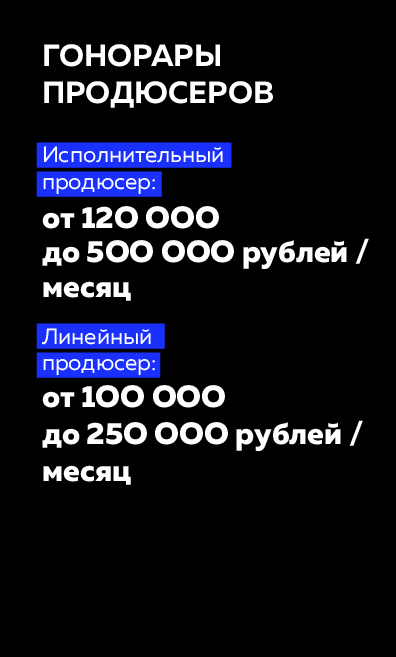 Продюсер прекрасно образован, всегда легко находит общий язык с совершенно разными людьми, знает, как и за счет чего привлечь партнеров, держит руку на пульсе проекта и знает эффективные варианты решения любой кризисной ситуации.